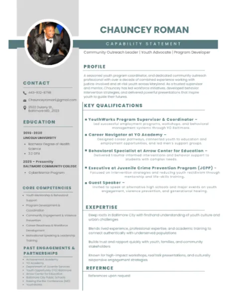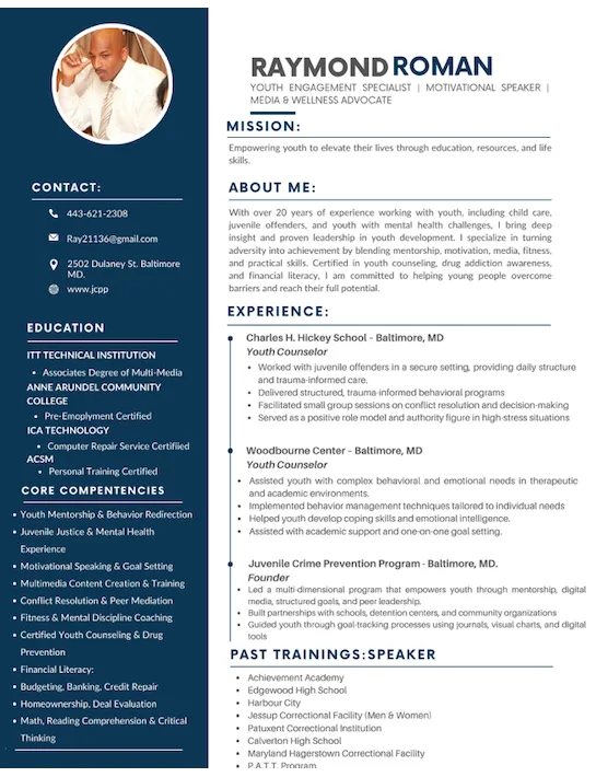 Raised in Baltimore, Raymond Roman turned early struggles into a path of education, entrepreneurship, and service. He earned a multimedia degree, gained expertise in counseling and mental health, and became a successful real estate investor. In 2011, he founded JCPP to mentor and empower communities, inspiring youth to overcome challenges and achieve success.